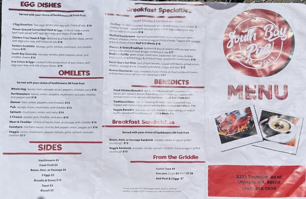 Welcome to South Bay Pub & Eatery, your ultimate dining destination in Olympia, WA! Nestled at 3323 S Bay Rd NE, we offer a cozy atmosphere perfect for families and friends alike. Enjoy a delicious range of American comfort foods, from hearty breakfasts to mouthwatering dinners, all within an affordable price range of $10-$20. Indulge in our excellent cocktails, a vast selection of local beers, and don't miss our happy hour specials. With live music, quick service, and wheelchair accessibility, South Bay Pub & Eatery is the perfect spot to unwind, savor great food, and catch your favorite sports action. Join us today!