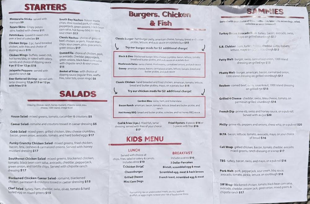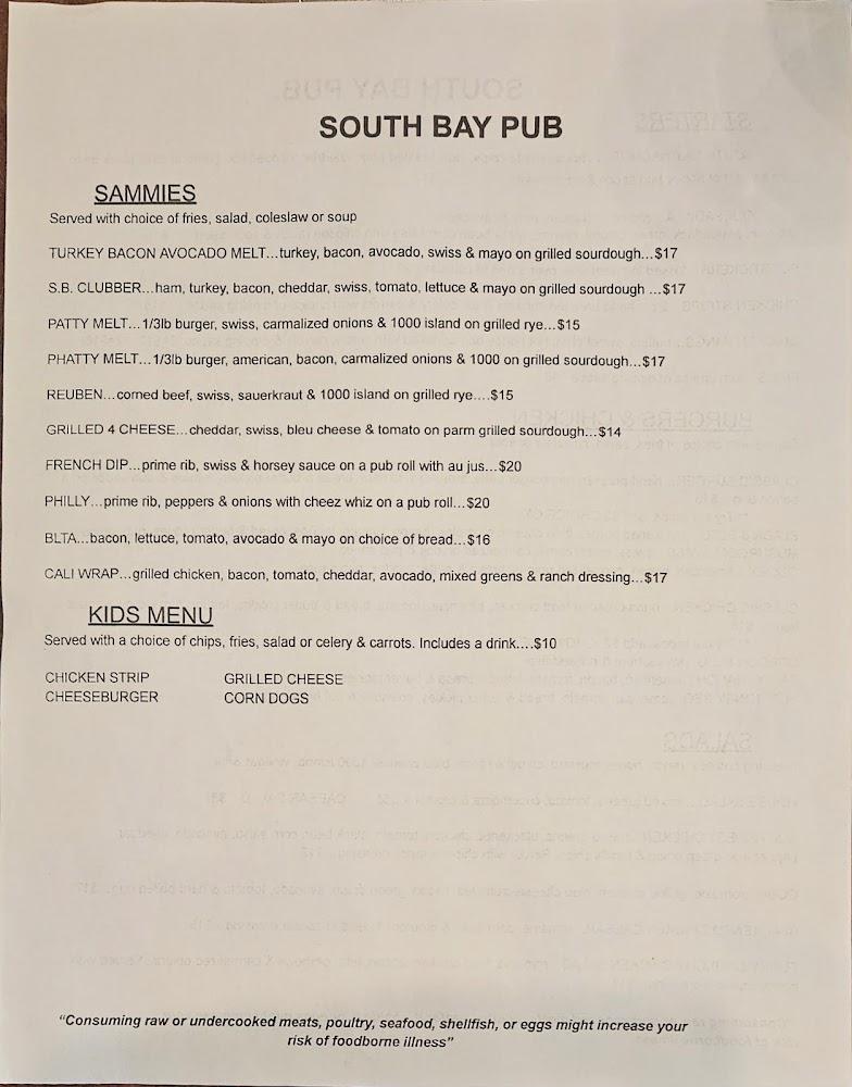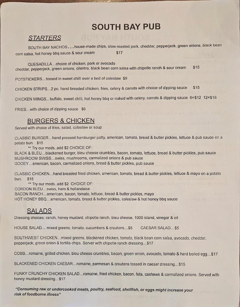The menu at South Bay Pub & Eatery showcases a delightful range of American comfort food. Breakfast shines with choices like the South Bay Scramble and unique Benedict variations. Lunch and dinner options include classic burgers, sandwiches, and hearty entrees like fish and chips. Along with delectable starters like mozzarella sticks and chicken wings, the place ensures a fun dining experience for all ages. Additionally, kids have dedicated menu items catering to younger tastes. Seasonal specials further diversify the menu, inviting patrons to explore new flavors, including local specials that highlight regional favorites.